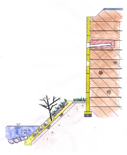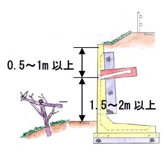| 【土柱ブロックの設置についての参考基準例】 ○外敵の侵入を防ぐ目的から、巣穴を設置する高さは地上から1.5m〜2m以上確保するのがよい。 ○同様の目的から、巣穴の部分から0.5m〜1.0m以上の垂直な盛土高さを確保するのがよい。 ○巣穴を保護する目的から上部には根を深くはる樹木を植えないようにするのがよい。 ○巣穴の前3m前後の距離に親鳥の給餌や雛が巣立つときに利用する「とまり木」を設置するのがよい。 ○土柱ブロックの設置する個数は擁壁の規模にもよるが、3〜5箇所程度を設置するのがよい。 ○地元専門家の方々のアドバイスをもらうこともお勧めします。 |