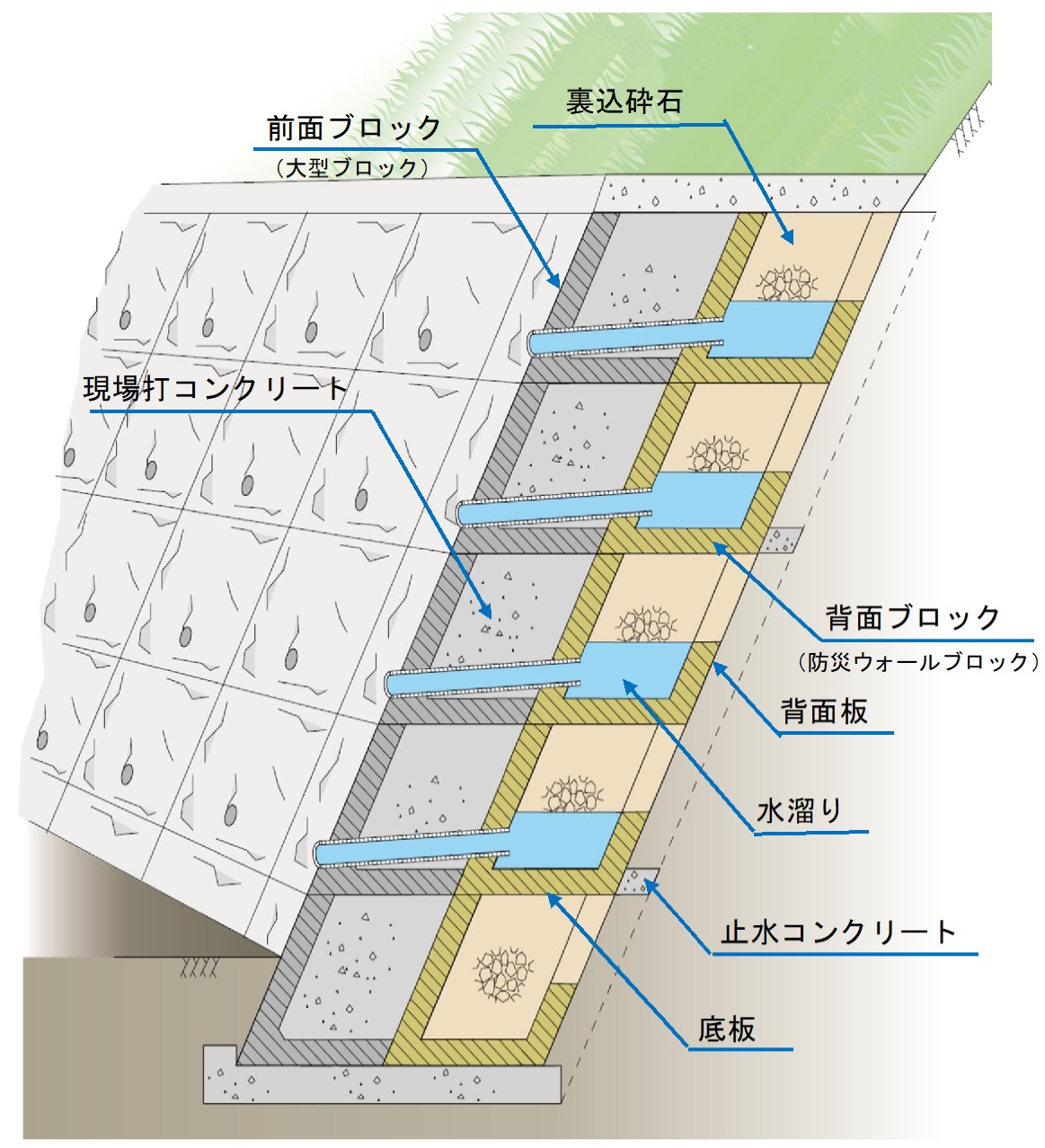 | トライグラス | コンクリート積ブロックと同様、控え350mmの環境保全型積ブロック 胴込コンクリートが上下、左右に連続した擁壁を構築します。 |